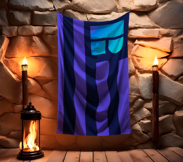 Flag hanging on a stone wall with torches and a lamp mockup s1c1